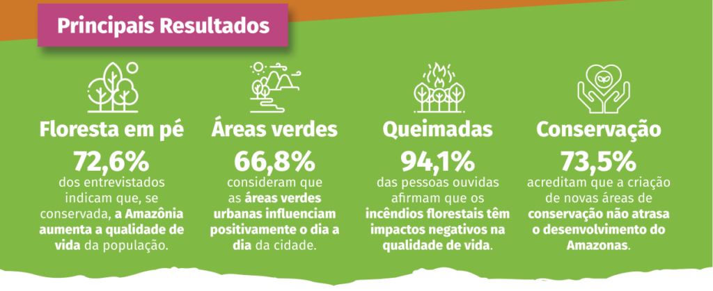 Foram ouvidos 1.018 moradores da área urbana da capital amazonense, com idades entre 16 e 70 anos. O objetivo foi mapear questões socioambientais prioritárias que influenciam na qualidade de vida das pessoas e que possam auxiliar na proposição de políticas públicas especificamente voltadas a essa temática. A Pesquisa de Opinião Socioambiental Manauara mostrou que, para 72,6% dos entrevistados, a floresta em pé significa mais qualidade de vida e é sinônimo de fonte de desenvolvimento para o estado do Amazonas. Outro destaque foi o fato de que 85,6% dos manauaras não acreditam no discurso de que é preciso desmatar para desenvolver.