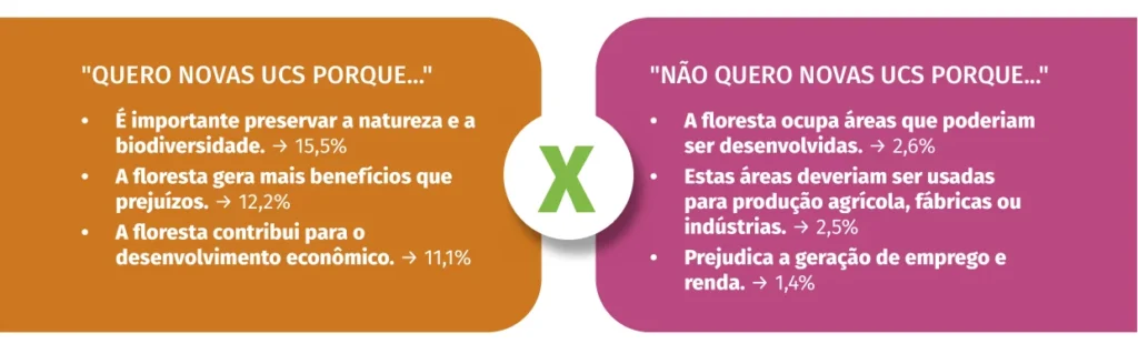 Para 87% da população, a criação de unidades de conservação também está interligada com a importância da preservação de espécies-bandeira, como o sauim-de-coleira (Saguinus bicolor), um sagui encontrado em parte da Amazônia brasileira, incluindo a cidade de Manaus. Outros argumentos a favor da criação de novas unidades de conservação foram de que existem alternativas para desenvolver sem precisar desmatar, como atividades de manejo e de extração de produtos florestais, mas que, para isso, é necessário mais investimento em educação, pesquisa e desenvolvimento.